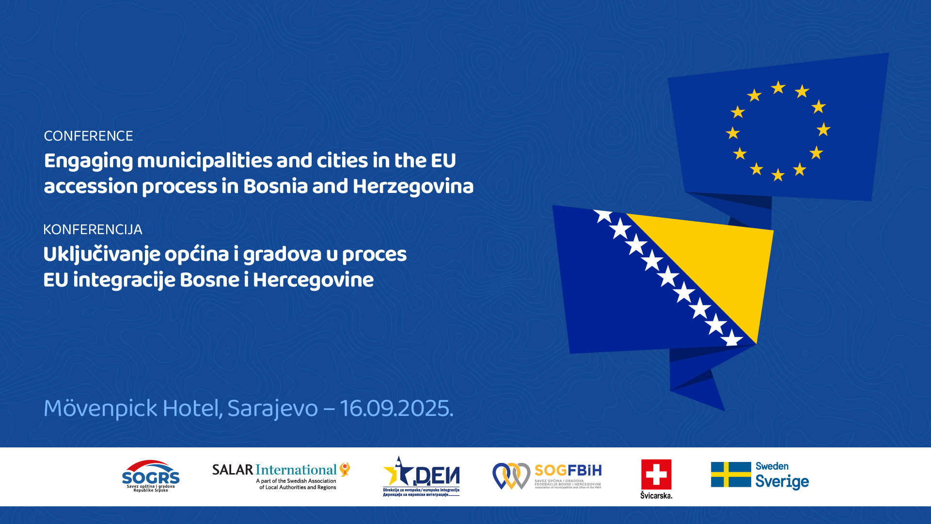 Savez općina i gradova Federacije Bosne i Hercegovine, zajedno sa Savezom opština i gradova Republike Srpske i Direkcijom za evropske integracije (DEI), uz podršku Švedske asocijacije lokalnih vlasti i regija (SALAR), organizuje značajnu konferenciju i zajednički sastanak EU mreža pod nazivom: